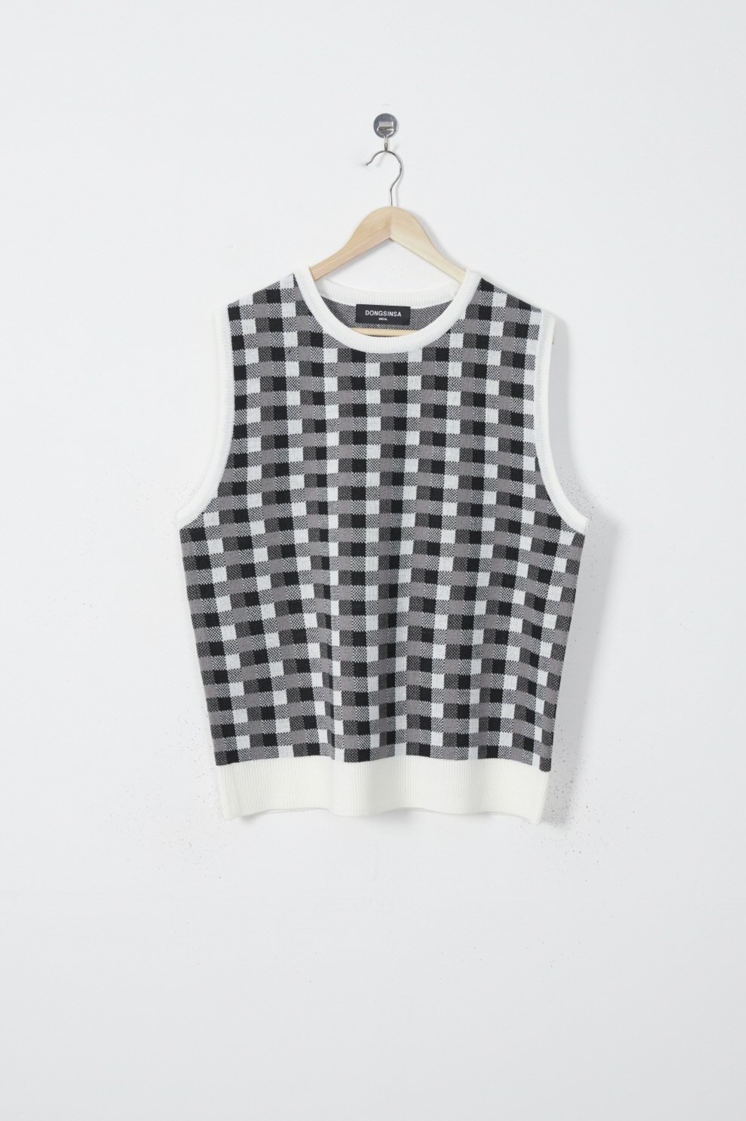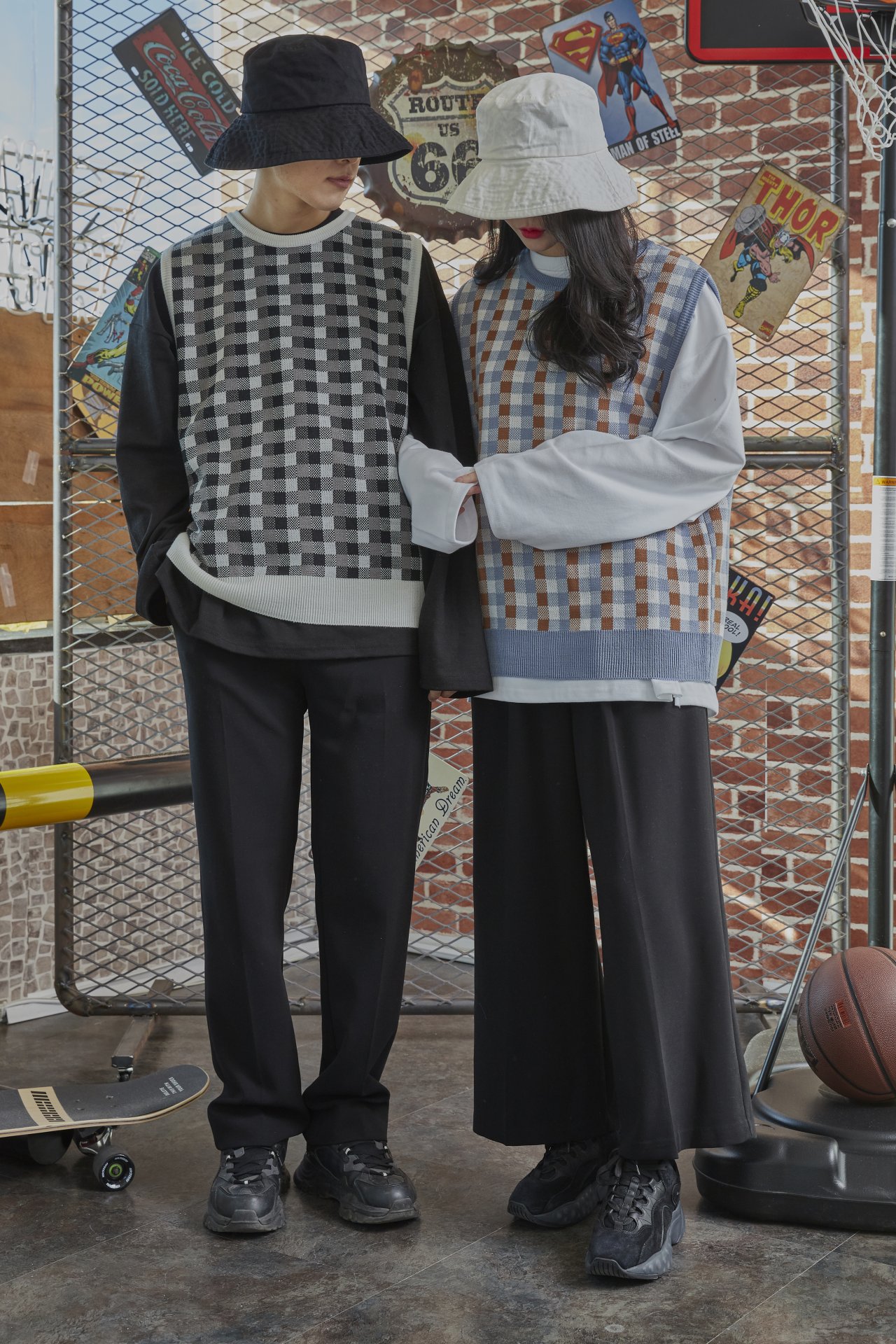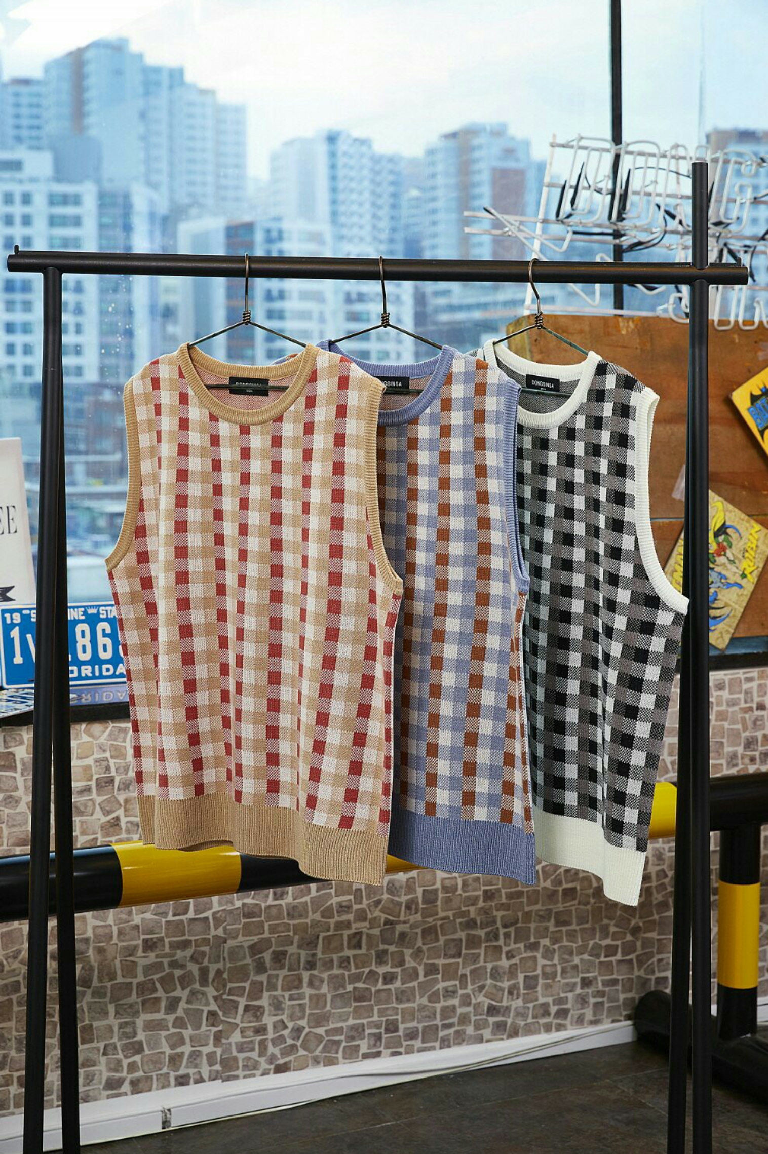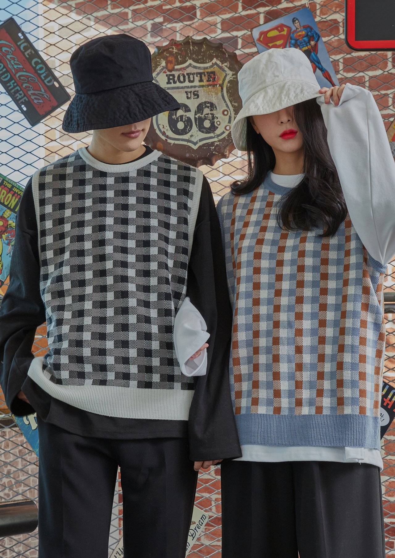 [DS] 커플 바둑판 체크 패턴 라운드 루즈핏 니트 조끼 베스트