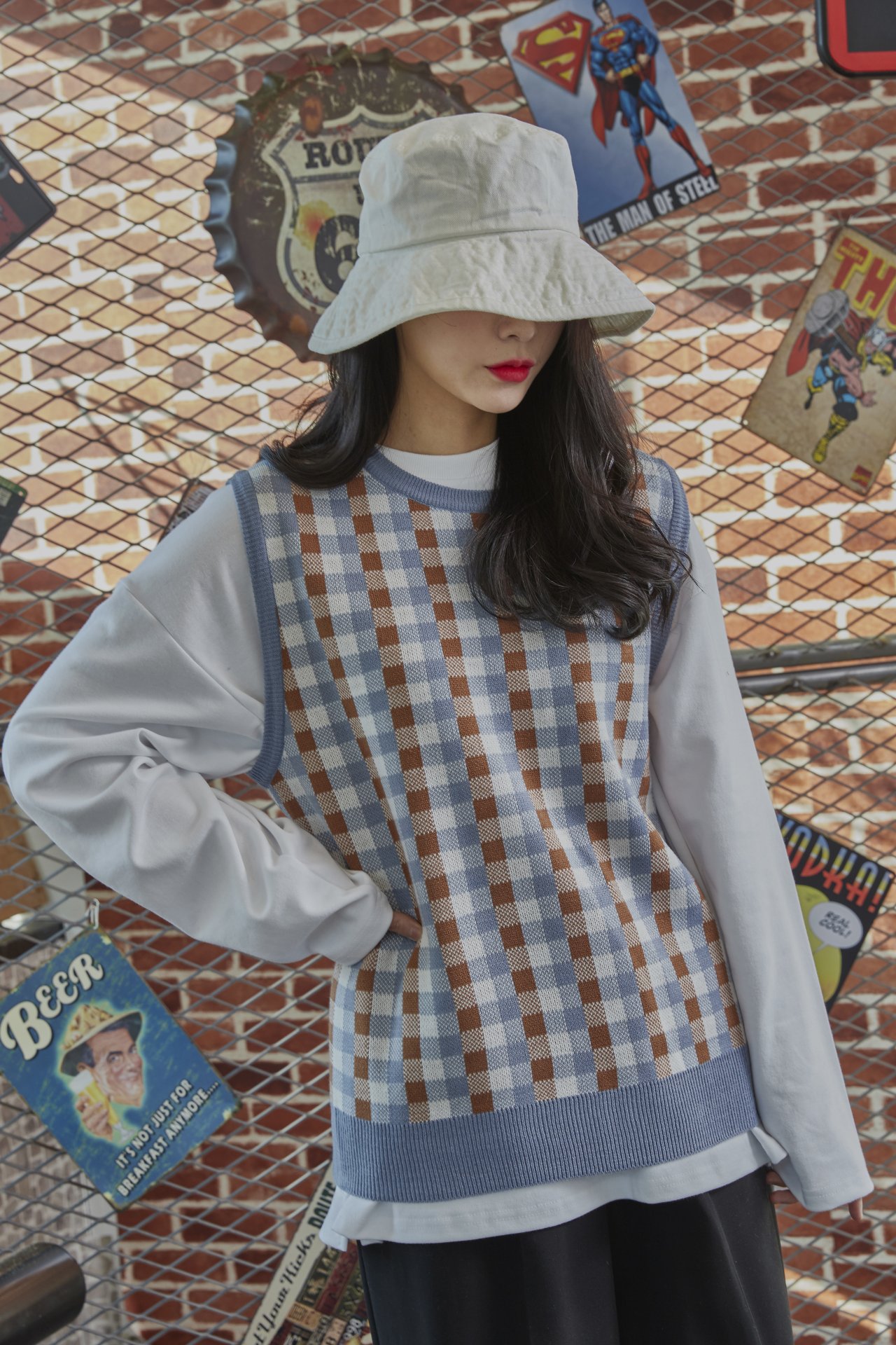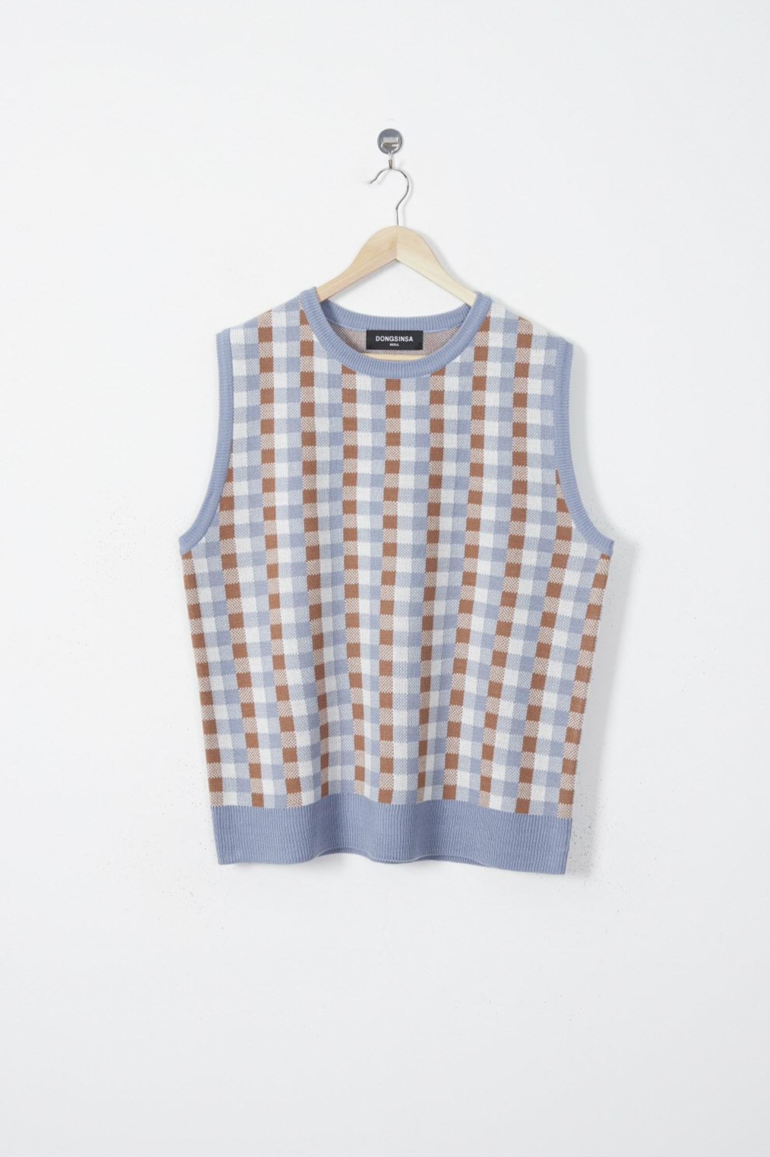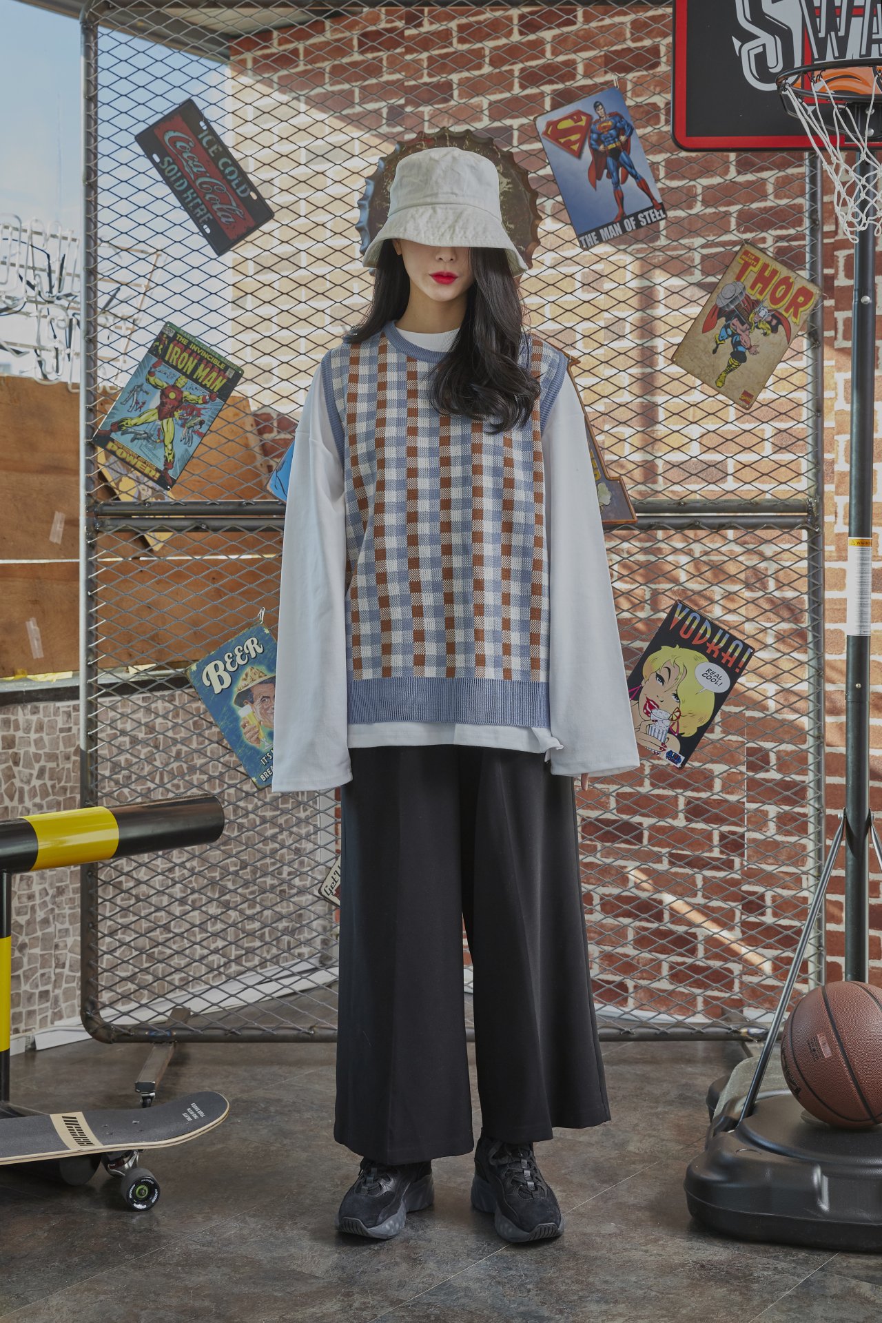 [DS] 커플 바둑판 체크 패턴 라운드 루즈핏 니트 조끼 베스트