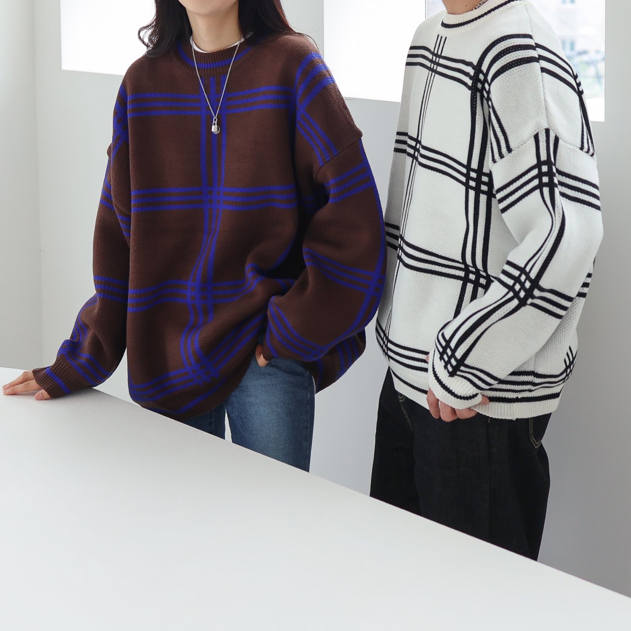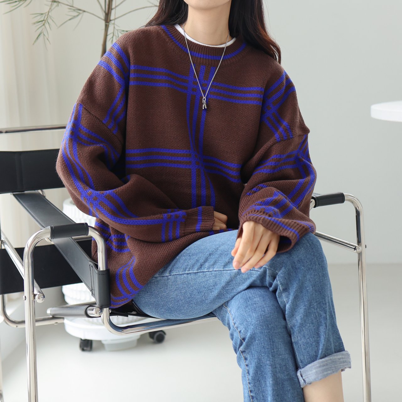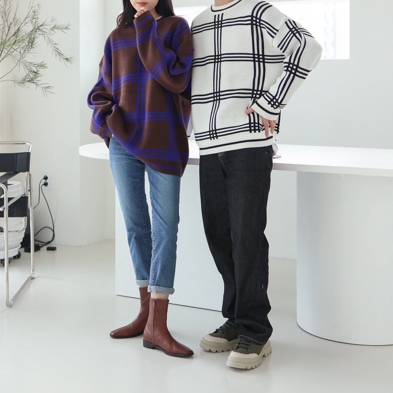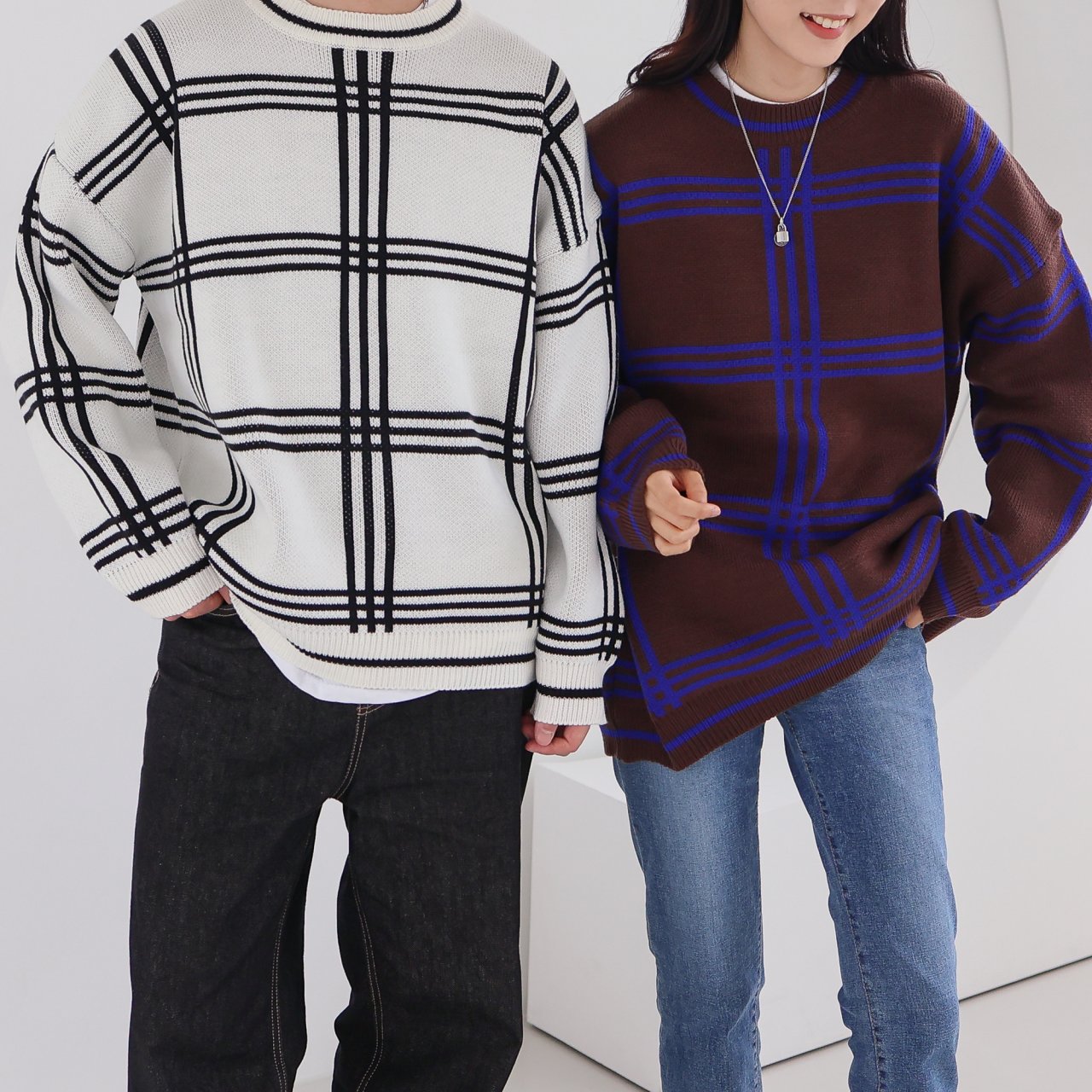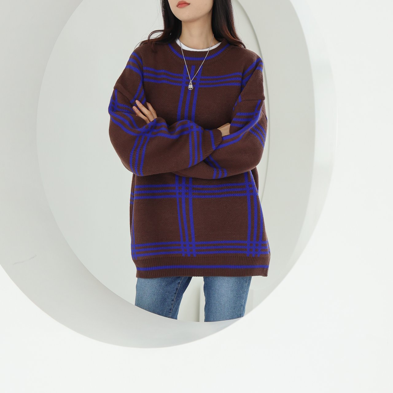 디투 체크 체크 라운드 니트 스웨터 : 브이핏